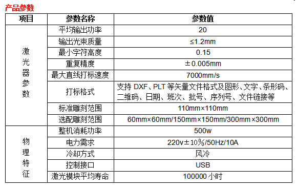 適用于大型工件或不規則工件打標,電光轉換效率高,采用風冷冷卻方式,耗電量小,整機體積小,輸出光速質量好,可靠性高,使用壽命可達10萬個小時。可雕刻金屬材料和部分非金屬材料,主要應用于對深度、光滑度、精細度要求 較高的領域